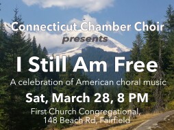 All are welcome to join the Connecticut Chamber Choir for an evening celebrating American choral music, titled I Still Am Free. This vocal ensemble will share pieces by Effinger, Kjelson, Parker, Shaw, Siegfried, Thompson and Walker. Directed and conducted by Michael Ciavaglia, accompanied by pianist and organist Galen Tate with oboist Olav Van Hezewijk.